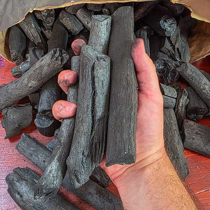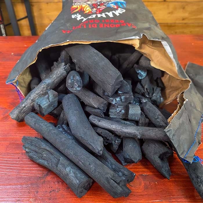 Il Carbone che proponiamo e abbiamo selezionato è formato da pezzi di varie dimensioni, anche lunghi 15/18cm, che vi permettono di mantenere una temperatura di cottura uniforme dato che hanno pezzature simili.
