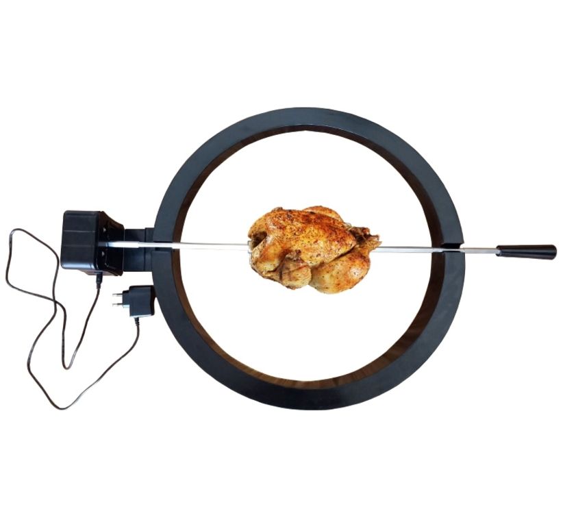 Con questo accessorio Kamado Bono si possono preparare arrosti di carne, arrosto di maiale, picanha o pollo allo spiedo, affidandosi alla cottura casalinga che soltanto l’uso combinato di un girarrosto e di un kamado con coperchio chiuso può garantire. Il girarrosto funziona con una normale presa di corrente.