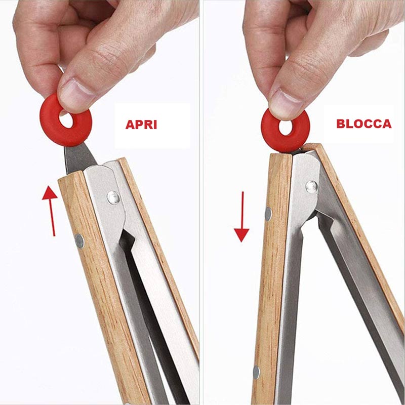 Pinza BBQ in acciaio uso alimentare, con extra giunzione in legno sul manico per un grip migliorato. Comodo ring per blocco dell’apertura della pinza.