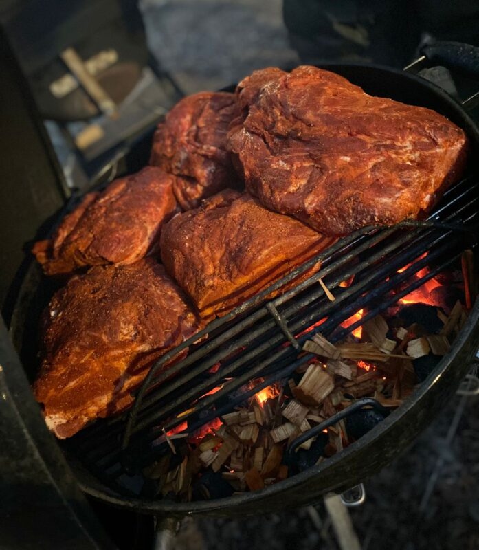 Mettere in cottura indiretta a 110/130 gradi affumicando con legno di ciliegio fino a completa formazione del bark che avverrà circa a 70/75 gradi.