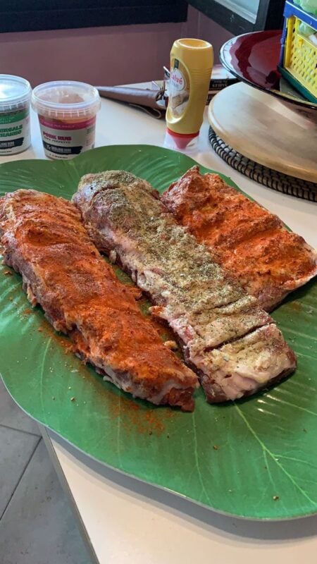Trimmare le costine rimuovendo grossolanamente il grasso superficiale e la pleura dietro le ossa e cospargere con il rub.